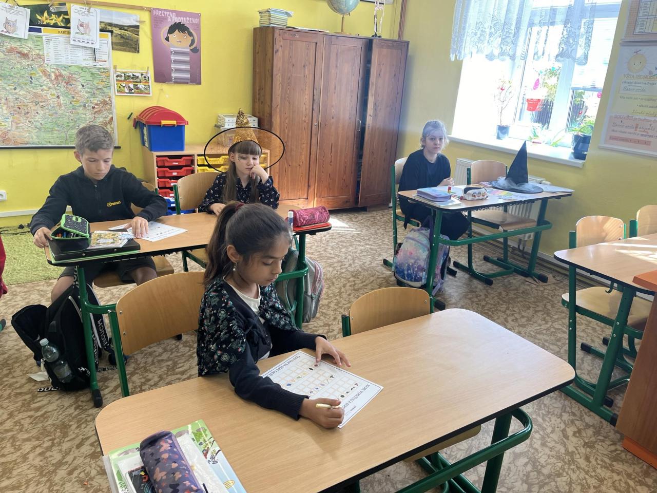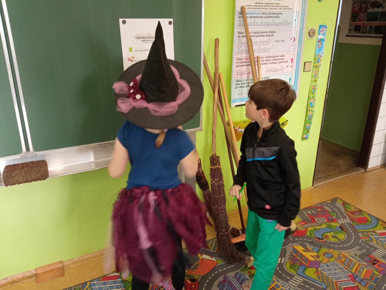 U vchodu žáky přivítal pavouk Pepa, kterého znají už z minulého roku. Na malé čarodějky a čaroděje čekal čarodějnický pedagogický sbor. Žáci obdrželi pozvánku do školy a čarodějnický průkaz, který je opravňoval k účasti na výuce. Tento den se vyučoval čarodějnický jazyk, matematika profesora Dlouhovouse, při TV byla košťatová rozcvička a hrál se famfrpál. Starší čarodějové a čarodějnice unikali z Jedové chýše plněním různých tematických úkolů, dozvěděli se, jak se slaví čarodějnice ve světě a rozšířili si slovní zásobu v anglickém jazyce. Na konci vyučování byli čarodějky a čarodějové odměněni vysvědčením a leteckým průkazem. Celé vyučování jsme si společně užili.