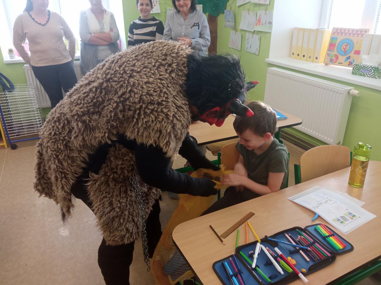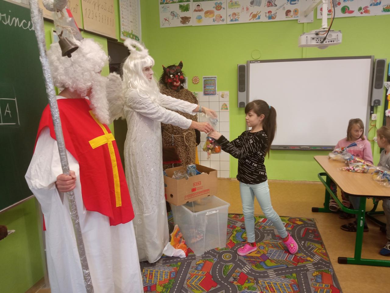 Mikuláš s andělem a čertem na naše děti nezapomněli. Od dětí si poslechli básničky a písničky a za odměnu jim dali balíčky plné dobrot.