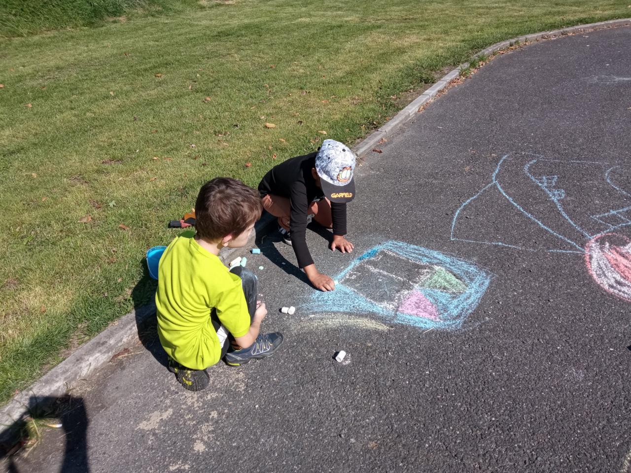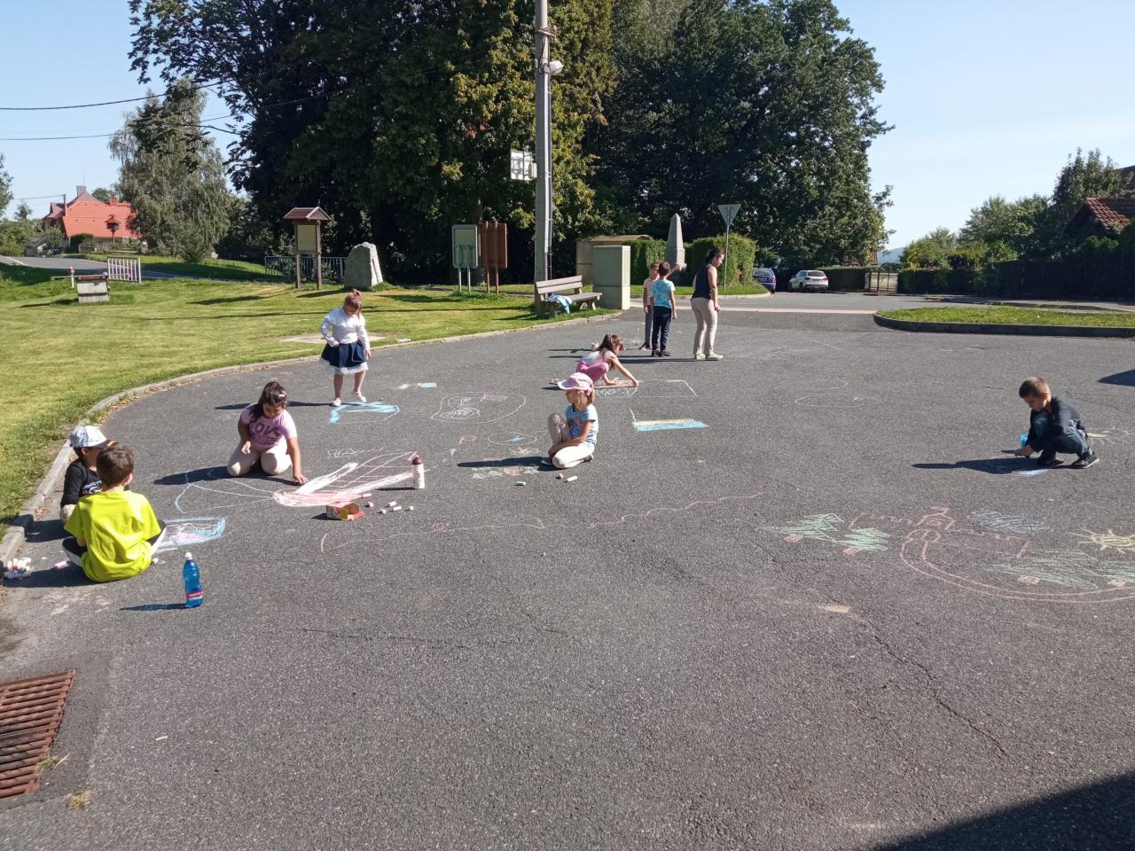 První školní týden jsme využili krásného počasí a hodiny výtvarné a tělesné výchovy jsme strávili venku. Soutěžili jsme, hráli hry a malovali.
